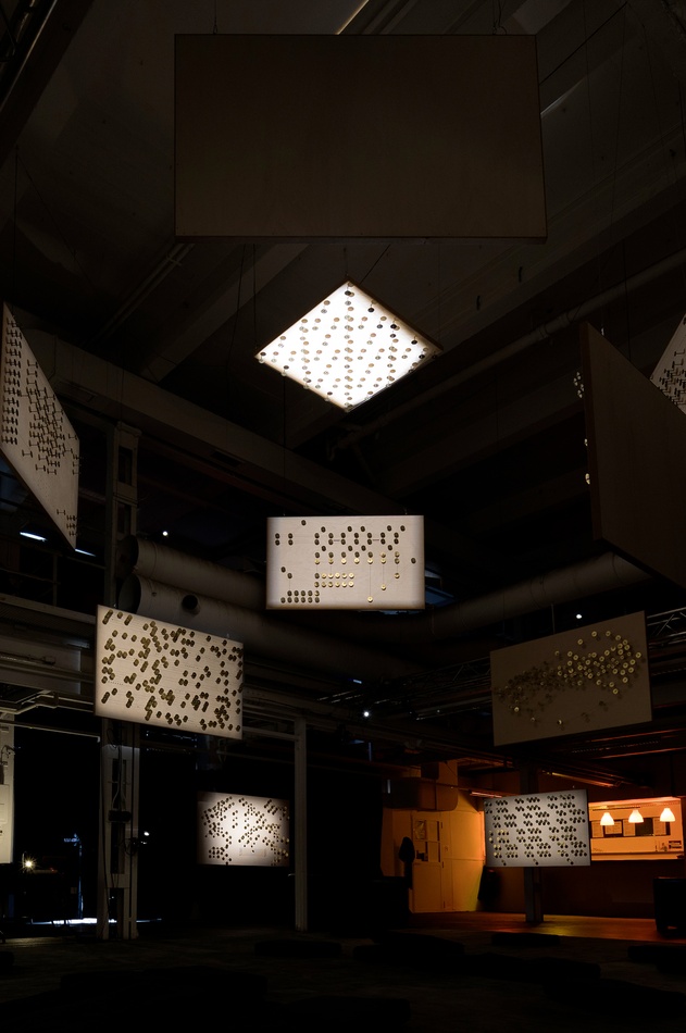 Multiverse of a Birdcage est un projet d’Alexandre Joly, qui a réalisé les panneaux haut-parleurs, et Daniel Zea, qui a conçu l’interface de diffusion sonore. L’installation est composée de 17 panneaux haut-parleurs suspendus dans l’espace, formant un système de diffusion à 17 voix. Cet acousmonium hybride contient environ 1’500 piezos, ces petites pastilles qui vibrent lorsqu’elles reçoivent un signal. Fixées à l’aide d’aimants sur des tiges en acier et reliées entre elles par des fils de cuivre et des cordes à piano, ces connexions apparentes dessinent des compositions graphiques et rappellent l’imagerie d’une lutherie expérimentale. Ces instruments de diffusion colorent les sons avec de subtiles réverbérations qui se révèlent à travers leurs mouvements dans l’espace. À la manière d’un salon d’écoute, Multiverse of a Birdcage invite à l’exploration de multiples univers sonores. Cet instrument collectif diffuse un répertoire de pièces sonores (actuellement 40) qui s’enrichit à chacune de ses présentations. Joly et Zea proposent à des artistes de mettre à disposition des pièces sonores qui sont diffusée par le dispositif.